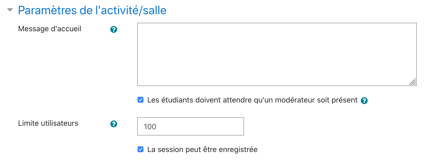 Message d'accueil : C'est un texte qui apparaîtra dans la zone de discussion directement dans l'activité BBB.